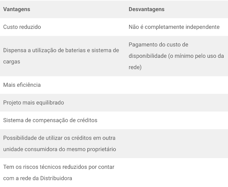 Na verdade, para saber qual o sistema ideal para você, é necessária uma avaliação estrutural do local da instalação, entre outras questões, como geográficas e técnicas para de fato estabelecer um parâmetro confiável. No entanto, para que você descubra as vantagens e desvantagens gerais dos sistemas on-grid e off-grid, preparamos um quadro com as principais de cada um.